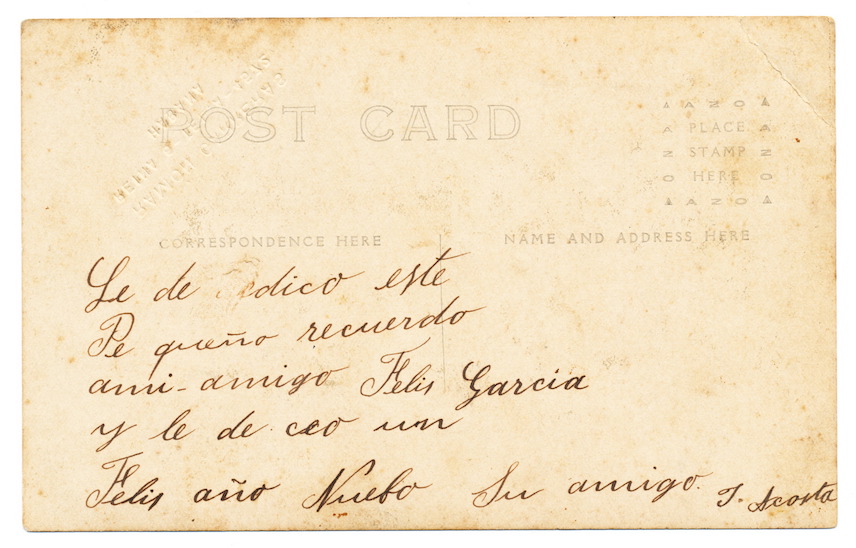 The postcard has been signed and inscribed by Acosta on the reverse. The embossed photographer's imprint reads "Ramon Carreras," which is interesting because Carreras was also the photographer for the 1910 Punch set.