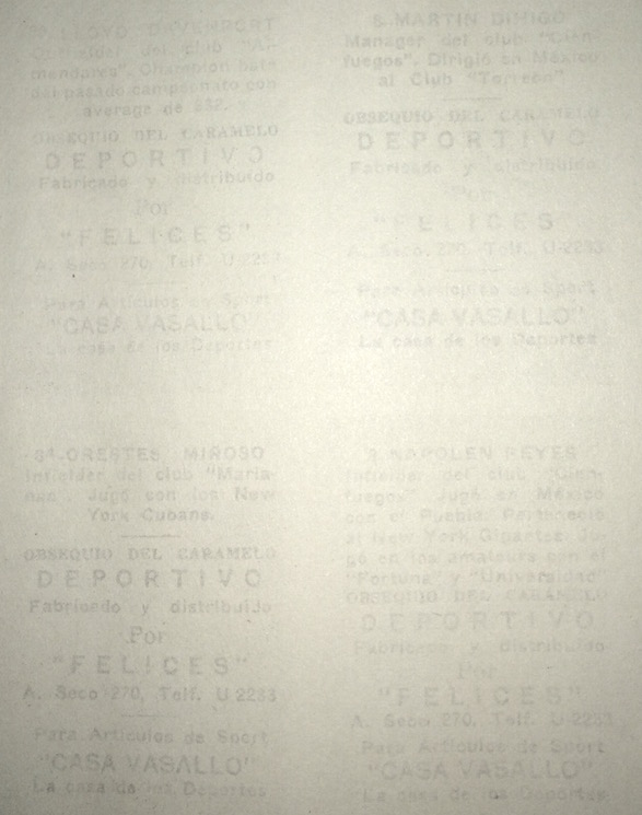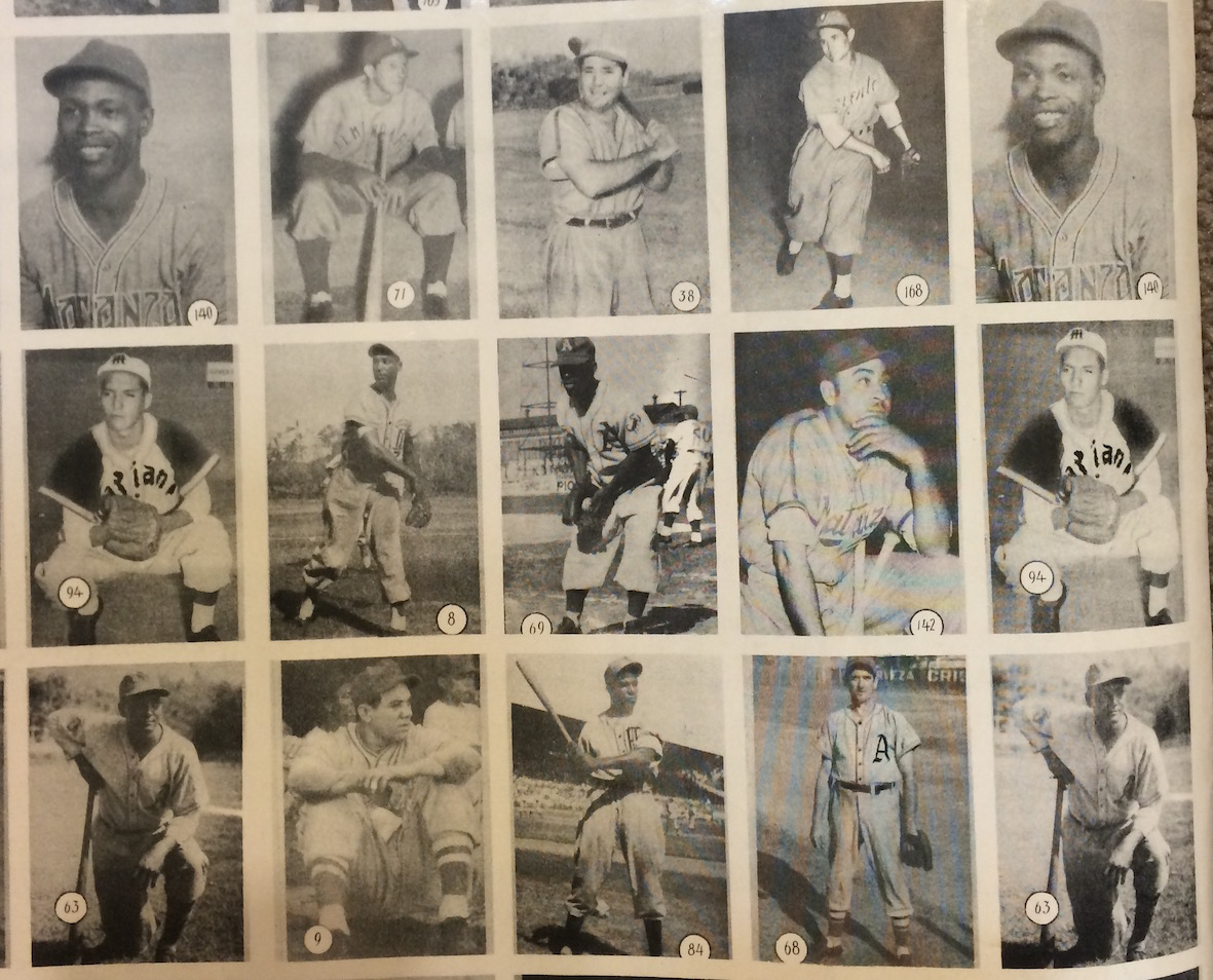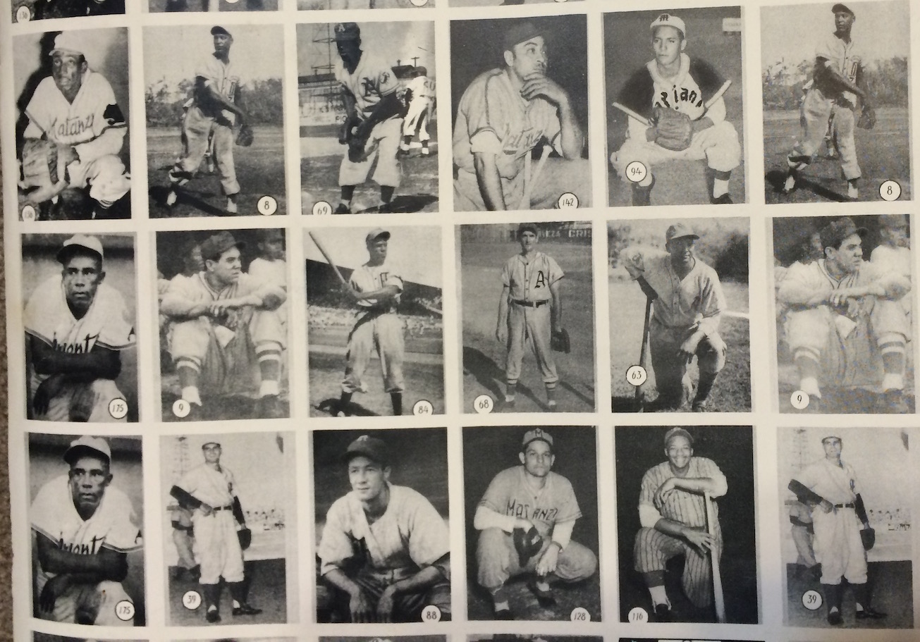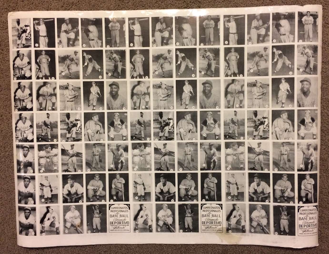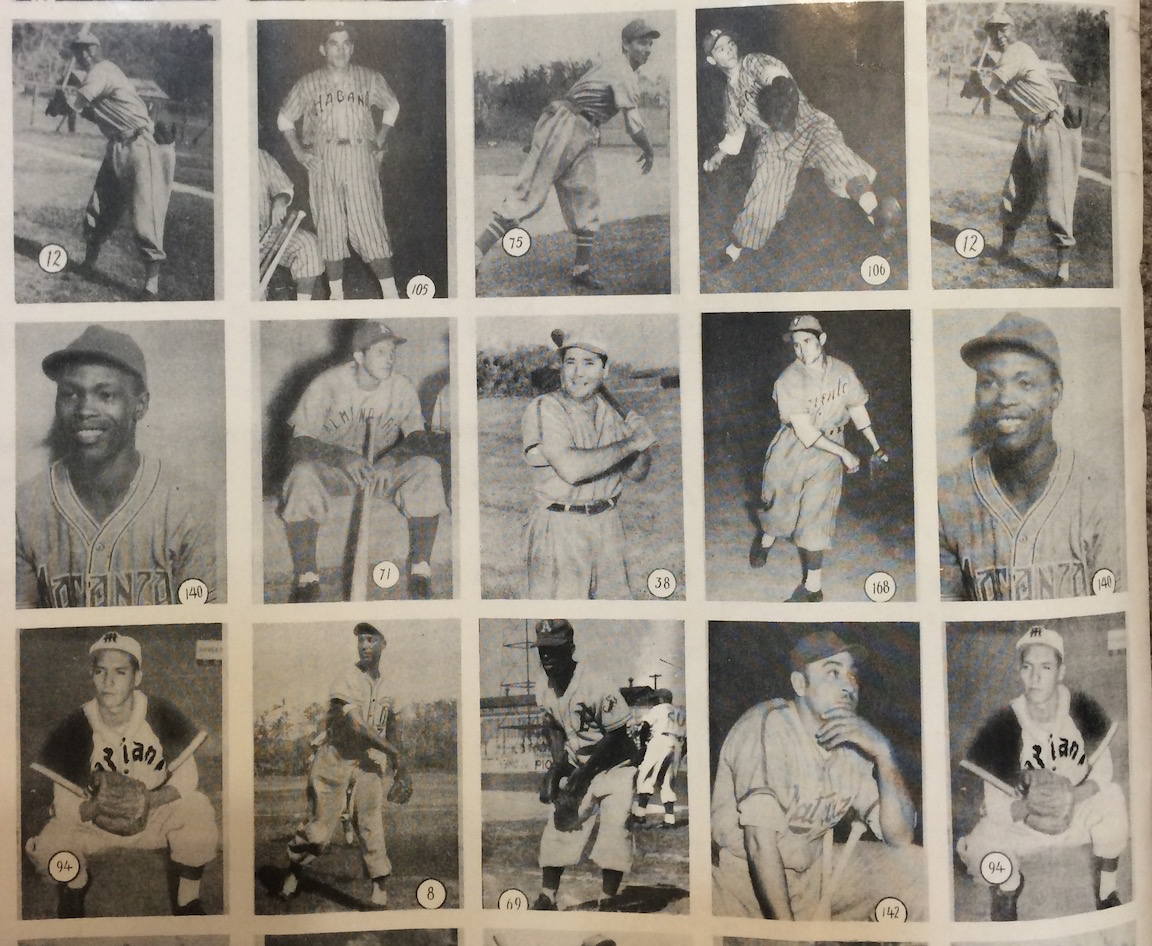 Uncut sheet of 1946-47 Caramelo Deportivo cards. It's amazing that an uncut sheet of Cuban baseball cards from the 1940s survived intact. Around 20 years ago, there was a find in Cuba that included this sheet and 6 or 7 others just like it. The backs of each sheet are very lightly printed, to the point that the is hard to even read. That is most likely the reason these sheets were never cut up and distributed as individual cards.