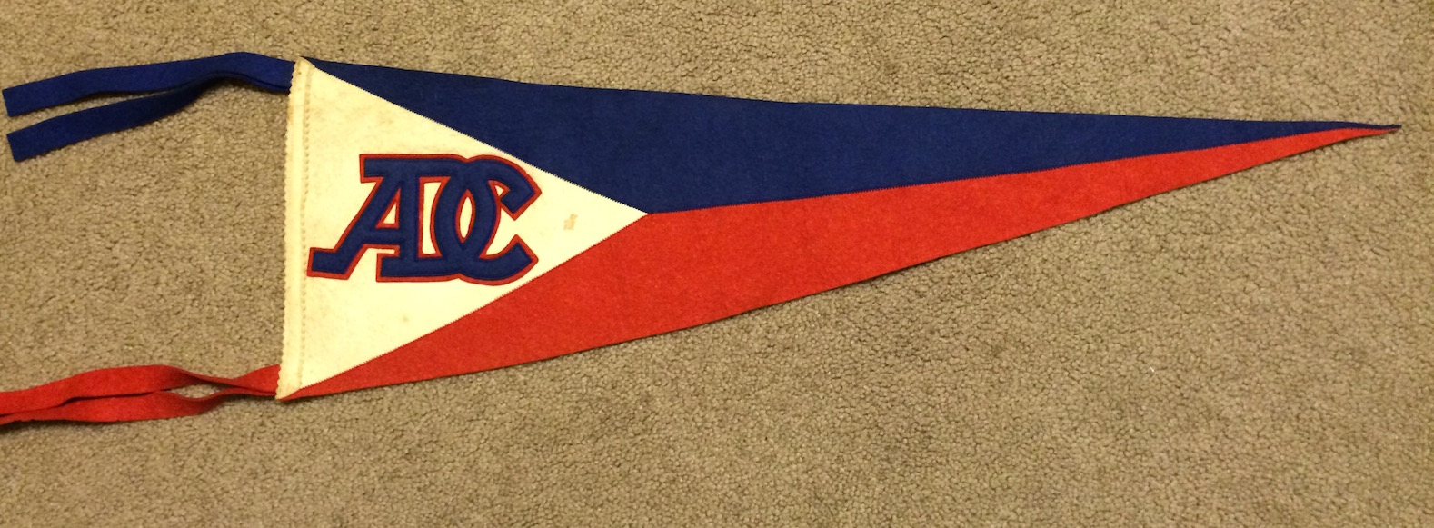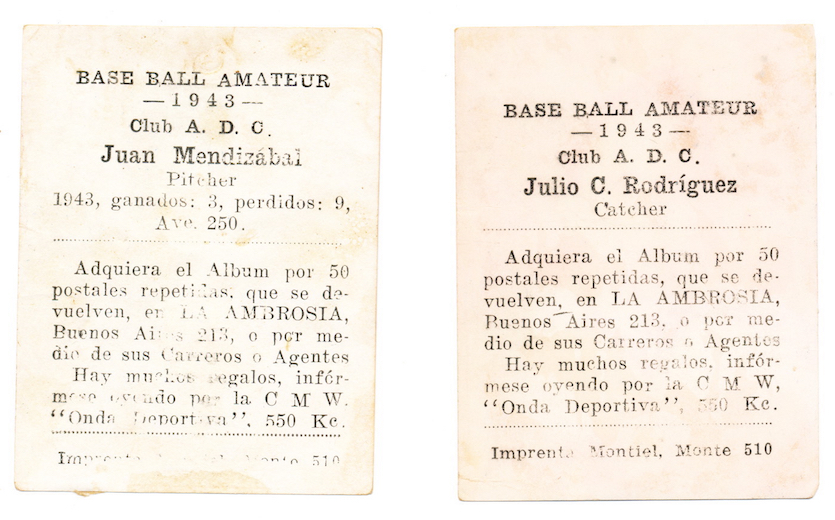 1940s pennant from Club A.D.C of the Cuban Amateur League. Also included are two cards from the 1943 La Ambrosia set featuring players on Club A.D.C. The pennant measures 34" long.